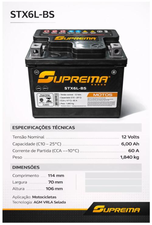 BATERIA SUPREMA MOTOS STX6L-BS 6AH